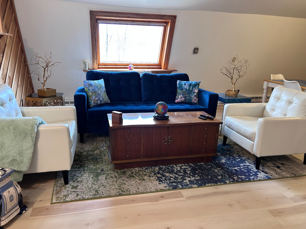 Et donem la benvinguda a Sunny Hill Road ! Estem ubicats en una petita comunitat d'allotjaments privats en un espai obert amb vistes a les muntanyes. Aquesta unitat d'un dormitori té tot el que necessites per gaudir de la teva estada a Catskills. Relaxa't a la terrassa privada o a l'interior amb vistes increïbles des de cada finestra. La cuina està totalment equipada i a punt per cuinar un àpat complet i després gaudir-ne al menjador amb vistes a les muntanyes. És tranquil i tranquil aquí, increïblement bonic en les quatre temporades!
