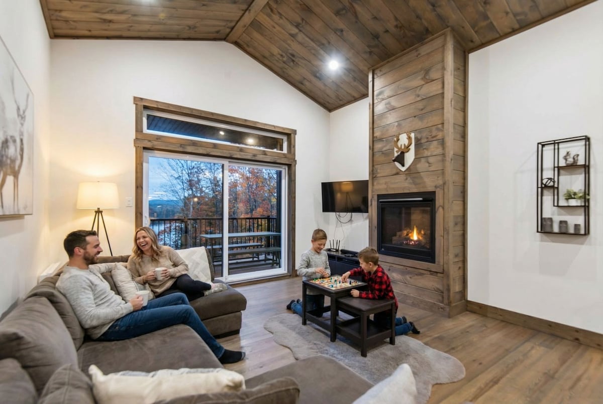 Welcome to our spacious and warm chalet Aux 4 Foyers! Here, your vacation will be full of rest ♪ ✧ Located only 60 minutes from Montreal ✧ Relaxation spa with a view of the lake! ✧ Fully equipped kitchen with a huge island and breakfast area. ✧ Work space, ideal for teleworking ✧ Indoor gas fireplaces + Pellet ✧ Outdoor Patio Heater ✧ Outdoor wood fireplace in summer