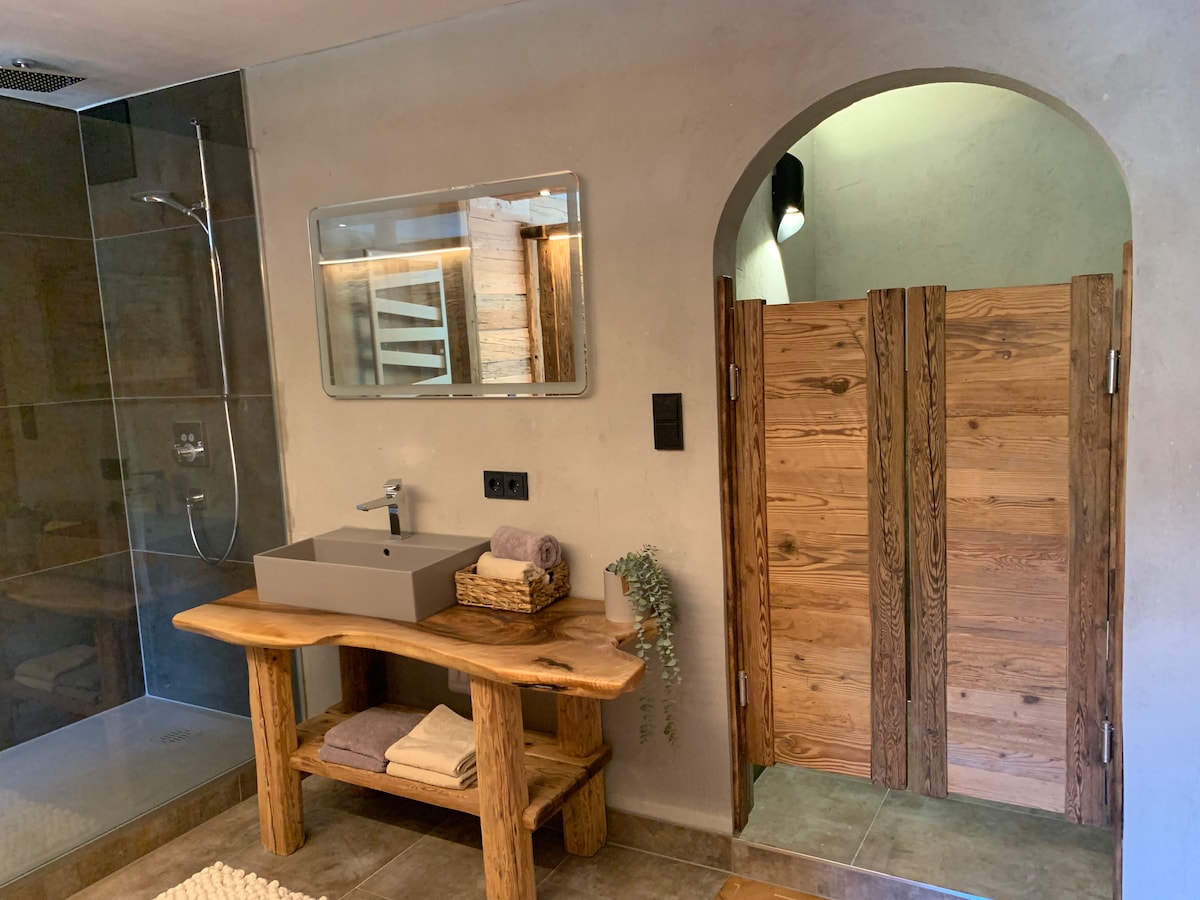 ganz neu 125m2, eigene Sauna, sehr geräumig, stilvoll, komfortabel. Küche mit Kochinsel, Backofen, Ceranfeld, Spülmaschine, Nespresso Kapselmaschine. Wohnzimmer mit großem Esstisch, Schlafcoach, Flat TV, und Kachelofen. 2 Schlafzimmer eines ein Traum im Zirbe mit Flat TV, WLAN, Safe, Badewanne, Dusche, Waschtisch, WC, Kosmetikspiegel, das andere in Altholz, mit Falt TV, Safe, großer offener Dusche, Waschtisch, WC, Kosmetikspiegel. Eigener Eingang, eigene Terrasse, Safe, großzügiger Hausgang