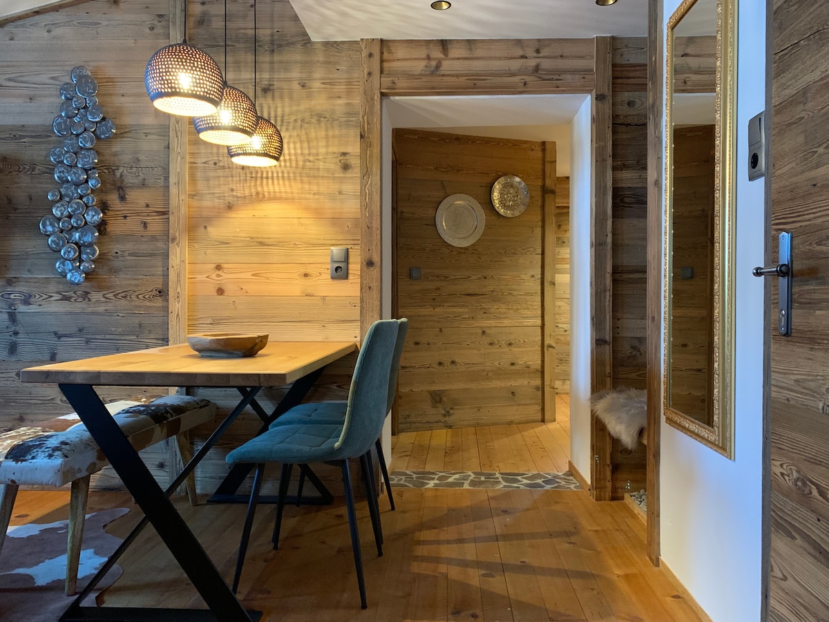 Sandro befindet sich im 1.Stock, Sauna und Frühstück buchbar. Die Wände in Altholz, gemütliches Lichtkonzept, hochwertige Möbel aus Holz, Verdunklungs-Vorhänge, WLAN. Separates Schlafzimmer mit Flat-TV und Safe. Eigenes Kinderzimmer mit Stockbett. Die Wohn-Küche ist ausgestattet mit Ceran-Kochfeld, Geschirrspüler, Mikrowelle, Nespresso Kapsel Maschine, Wasserkocher, Toaster. Badezimmer verfügt über ein Waschbecken, Unterschrank, Kosmetikvergrößerungsspiegel, Spiegel, Föhn, WC, Dusche