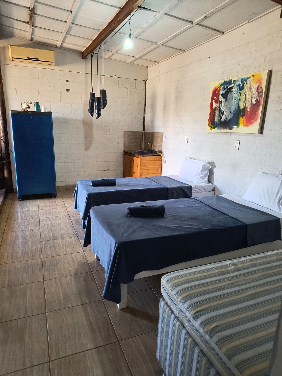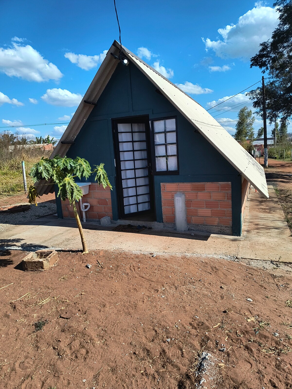 🏡 Chalé Country – Tranquilidade com toque rústico e acolhedor! Cozinha com utensílios básicos (panelas, pratos, copos e talheres), conta com fogão elétrico, geladeira, pia e tanque. Acomoda com cama King Flex (vira duas de solteiro), roupas de cama e toalhas inclusas. Dispõe de ar-condicionado, chuveiro quente, TV, Wi-Fi, varanda com rede de descanso. Área externa com vista para o campo, piscina, estacionamento com câmera silenciosa, churrasqueira móvel e jardim.