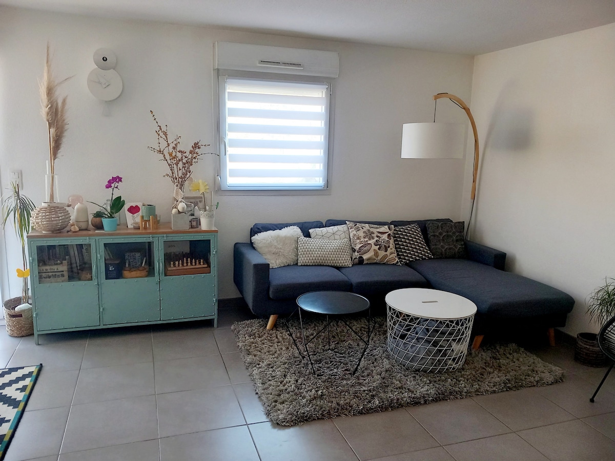 Vous pouvez vous garer gratuitement dans la cour devant l'appartement. Magnifique logement neuf indépendant, très calme, dans une maison individuelle ( Hall d'entree commun) - TRES Grande douche à l’italienne,Salle de bain travertins. - canapé d’angle, table à manger pour 2, TV, wifi, Netflix ( vos codes), Chromecast , coin bureau. - Cuisine totalement équipée. - Chambre lit double standard grand dressing. - machine à laver En été, Terrasse zen relaxante, pergola, hamac , table etc..