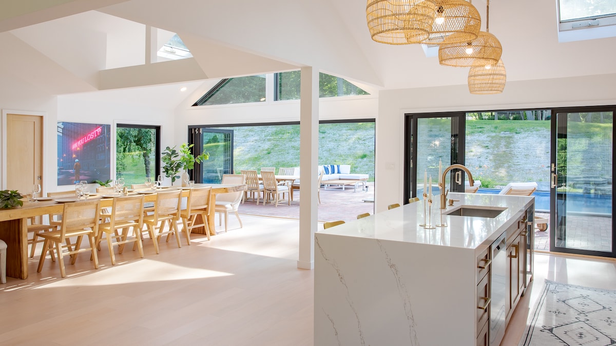 Una nova masia modernitzada amb una piscina d'aigua salada climatitzada al cor de North Fork. Situat en una hectàrea de pati exuberant i totalment tancat, l'allotjament pot allotjar fàcilment fins a 8 hostes i tots els animals de companyia. A minuts de Love Lane (l'encantador centre de Mattituck), Breakwater Beach (una de les millors platges de North Fork), l'estació de tren Mattituck i que envolta els premiats Bridge Lane Vineyards i la pintoresca Seabrook Horse Farm, aquesta casa bucòlica ofereix l'escenari perfecte per a una escapada a North Fork.