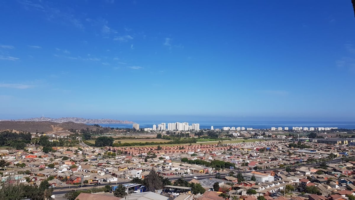 Preciós pis NOU, equipat per a 3 persones, situat en un apartament de primer nivell, amb boniques zones comunes, amb una vista privilegiada i panoràmica de pràcticament tot Coquimbo. Es troba al sector El Llano, a pocs passos de l'Hospital Coquimbo, les Corts de Justícia, el Club de Tennis, el centre de Coquimbo. Des de la terrassa es poden veure les 2 platges: Herradura i Avinguda del Mar, fins i tot es pot veure dins de l'Estadi. En definitiva, una vista i una ubicació inmejorables!