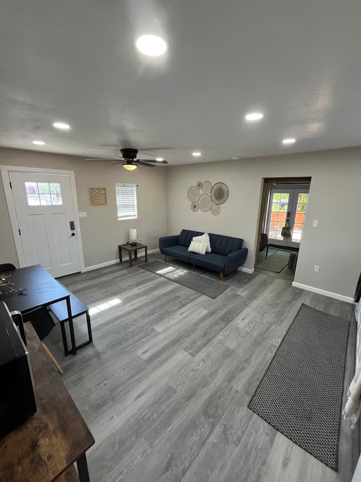 Modern 2-bedroom home in Rio Rancho. Everything was remodeled. 2 bedrooms with queen beds, and a fully non-smoking space. A small third bedroom I keep private as an owner's closet. Adjacent to Albuquerque, near Petroglyphs, Sandia Mountain Tramway, and about an hour+ to Santa Fe. Even though the entire home is "one level," there are two steps to a sunken living room. Free 50-amp EV charging outlet L2 (NEMA 14-50) so bring your own charging cable/adapter. (If you forget it, let me know.)