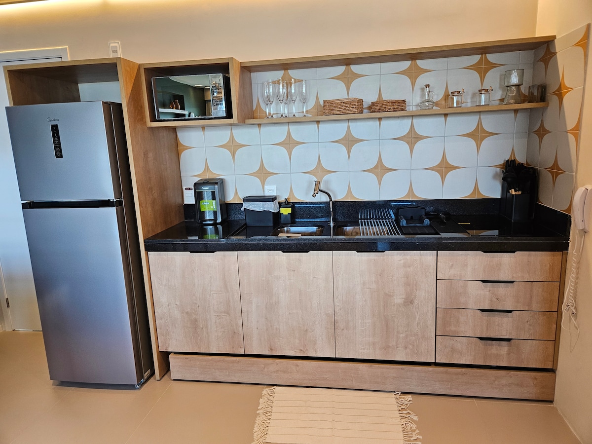 Preciós pis a la millor ubicació de Pina i Boa Viagem, al costat del centre comercial més bonic de Rio Mar, amb una bonica vista de 360 graus de la capital, bonica vista a l'oceà, on tot és a prop, apartaments amb 33m², 1 dormitori amb llit doble, armari i televisió per cable i internet, sala d'estar amb sofà gran i còmode amb aire condicionat i televisió per cable i wifi, cuina amb armari, nevera, microones, purificador, taula, licuadora, sandvitxera, cafetera, tots els estris de cuina, garatge