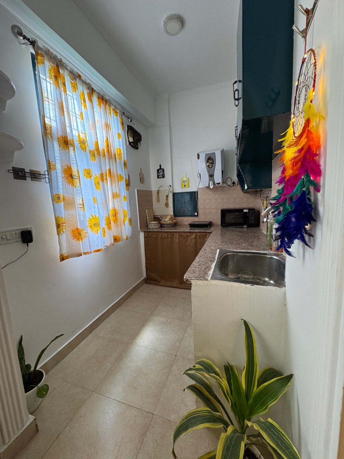 Welcome to our beautifully designed 1BHK apartment, nestled in the spiritual heart of Tapovan, Rishikesh. This home is not just a place to stay — it’s an experience. Thoughtfully decorated in vibrant shades of yellow and teal, this space reflects both energy and calmness — perfect for travelers seeking comfort, charm, and a touch of personality in their stay. Location is one of our biggest advantages. The apartment is just a 2–5 minute walk from Laxman Jhula, one of the most iconic bridges.