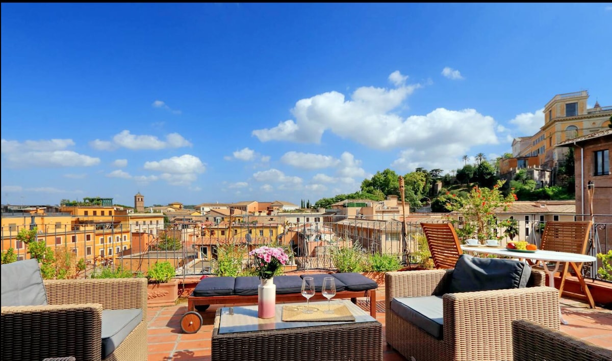 Bright and quiet penthouse apartment in the heart of Trastevere, with a wonderful terrace and an unparalleled view of charming roman roofs and the Gianicolo hill. The flat is meticulously refurbished and set in a picturesque cobblestoned street, just around the corner from the lively restaurants and cafes. La Casetta al Mattonato is located on the 3rd floor (41 steps, no elevator) of a 1600s typical roman building, within walking distance of all major attractions.