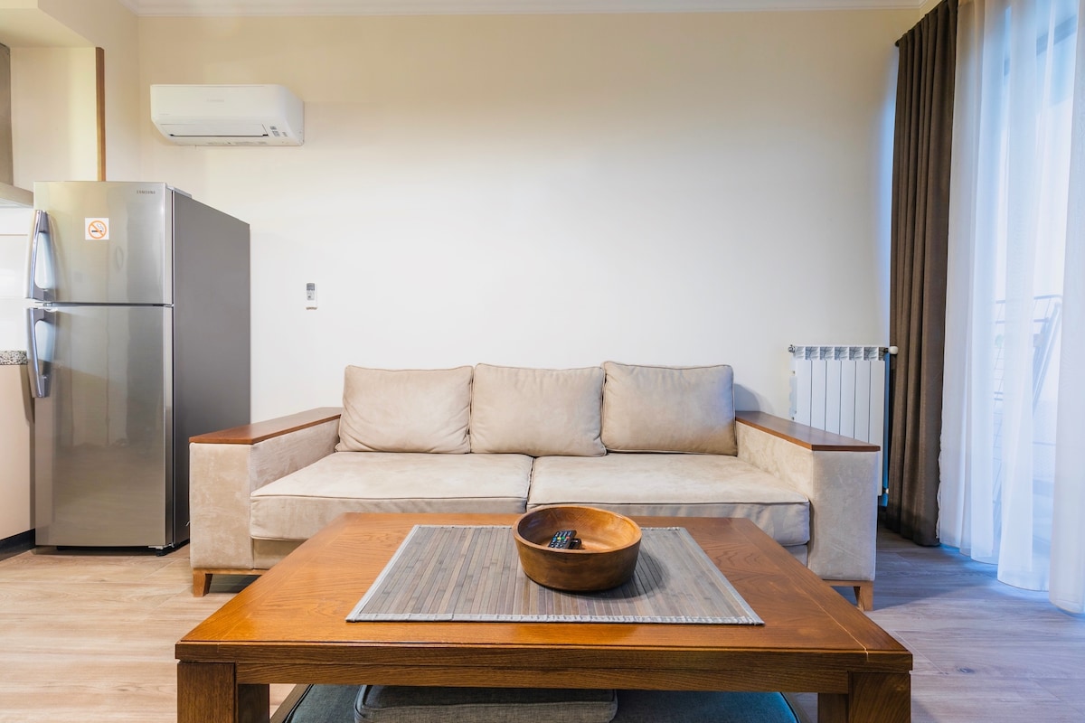 Modern, cozy stay in a secure complex with a Smart Lock, full kitchen (Oven/Dishwasher), private Balcony with Mountain views, and home Cinema (Projector, Apple TV, Netflix, screen mirroring) Enjoy 2 seasonal Pools, a Robot vacuum, workspace & large Vitrage windows :) On-site: Parking, Spar, Fruit shops, Gym, Salon, Hookah lounge, Parks, Dog areas, Basketball courts, and a Car wash. Across: Ice rink & Gymnastics. Perfect for relaxing or remote work in Tbilisi with Fresh air and 100 Mbps Wifi.