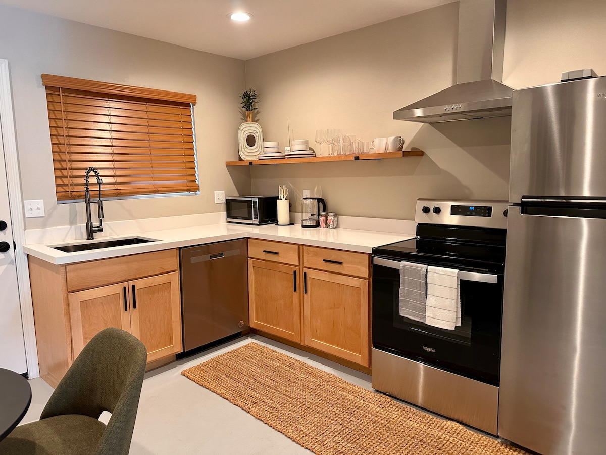 Inspired by Wabi-Sabi philosophy of finding beauty in imperfection, we created a stylish space with a hint of Japandi style. Come relax in this beautiful space. Unit offers a King bed, private bath & full-size kitchen. 21+ Coming Soon: *Pool is under construction. Currently, backyard access is restricted during construction.