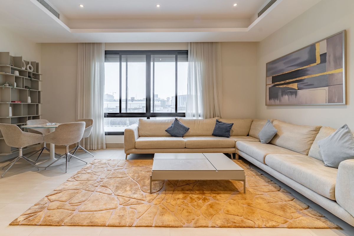 Modern i elegant apartament d'1 dormitori a Al Malqa, a només 10 minuts del Boulevard Riyadh City, Boulevard World & Kingdom Arena i a 8 minuts del centre comercial Solitaire Mall. Gaudeix de la comoditat a nivell d'hotel amb una sala d'estar acollidora, cafeteria Nespresso, cuina completa, televisor intel·ligent, llit «king size», bressol, llit plegable i accés independent. Aperitius i begudes gratuïts, wifi ràpid, aire condicionat, aparcament privat i fàcil accés a la parada d'autobús propera que connecta amb el metro de Riad