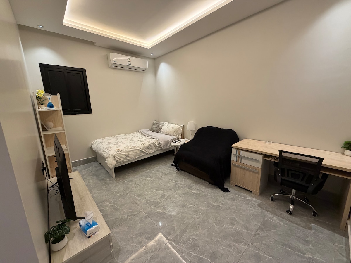 Gaudeix d'una estada tranquil·la en una habitació d'estil clàssic elegant, amb entrada privada i bany exterior independent amb acabat de marbre. L'habitació està equipada amb dos llits còmodes, una taula de menjador, una sala d'estar, una nevera i un aire condicionat silenciós. La ubicació està en un barri tranquil i segur al nord-est de Riad, a prop de l'aeroport i dels serveis. Adequat per a viatgers i visitants per a estades curtes o llargues. Alta neteja i equipament professional abans de cada reserva. No es permet fumar a l'habitació, només a l'espai exterior. Reserva amb confiança i gaudeix d'una experiència de 5 estrelles. Et preparem el cafè àrab amb molt d'amor, i la comoditat comoditat comencen des del primer moment que entres