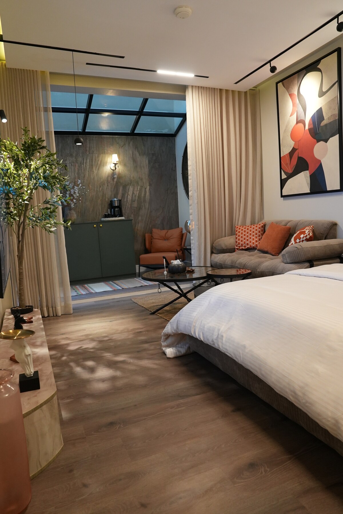 This unique place has a style all its own—designed to offer comfort, elegance, and a touch of luxury. Each room is thoughtfully furnished with chic décor and high-end finishes. Enjoy premium amenities including a Cinema VIPS experience, QLED flat-screen TVs, tea/coffee machines, hair dryers, plush towels, and a complimentary welcome pack. Whether you're here for a short getaway or a longer stay, you'll feel right at home with our modern comforts and personalized touches.