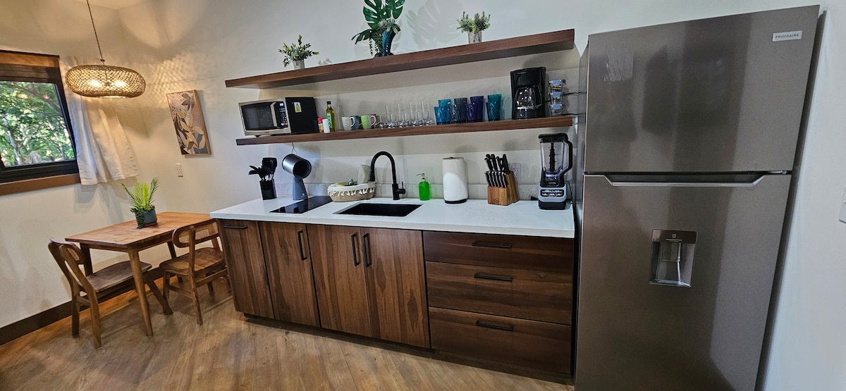 Situat al costat de la piscina, aquest increïble espai és un gran concepte obert amb sostres abovedats. La suite té un llit queen size i un bany ben equipat. Disposa d'una cuina completa amb tot el que necessites per a la teva estada. Disposa d'una àmplia sala d'estar i una zona de menjador independent. Passa el dia a la nostra piscina infinita i a la banyera d'hidromassatge envoltades de bosc tropical i paisatges, a pocs passos de la platja. Hi ha dos restaurants de 5 estrelles just a sota nostre a la platja per a la teva comoditat gastronòmica