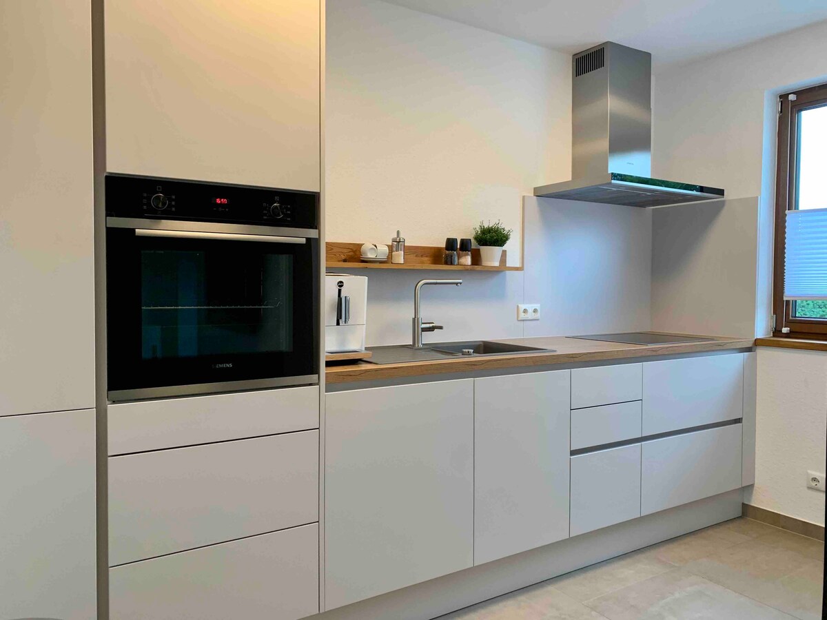 Asseu-te i relaxa't al nostre espai tranquil i elegant. A causa de la ubicació al costat del bosc, pots començar meravellosos excursions de senderisme o ciclisme des d'aquí i explorar l'Eifel. El nostre pis ha estat recentment reformat a principis del 2022. Hem posat molt d'èmfasi en materials naturals i d'alta qualitat. Amb cotxe pots arribar a Aquisgrà, Bèlgica o els Països Baixos de manera puntual. És possible aparcar i carregar bicicletes electròniques a la propietat per disposició.