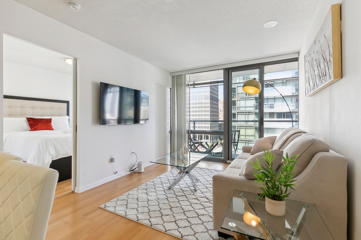 Instal·la't en aquest elegant apartament de 2 dormitoris en un dels barris més animats de Toronto. Amb 2 llits «queen size», un sofà llit còmode, una cuina completa, un espai per menjar i un televisor intel·ligent de 55", és ideal per a un màxim de 5 persones. A pocs passos de cafeteries, botigues, espais verds i transport públic, és el lloc perfecte per explorar la ciutat. Tant si et quedes un cap de setmana com si t'allotges per un temps més llarg, gaudeix de la comoditat i d'un ambient autènticament local.