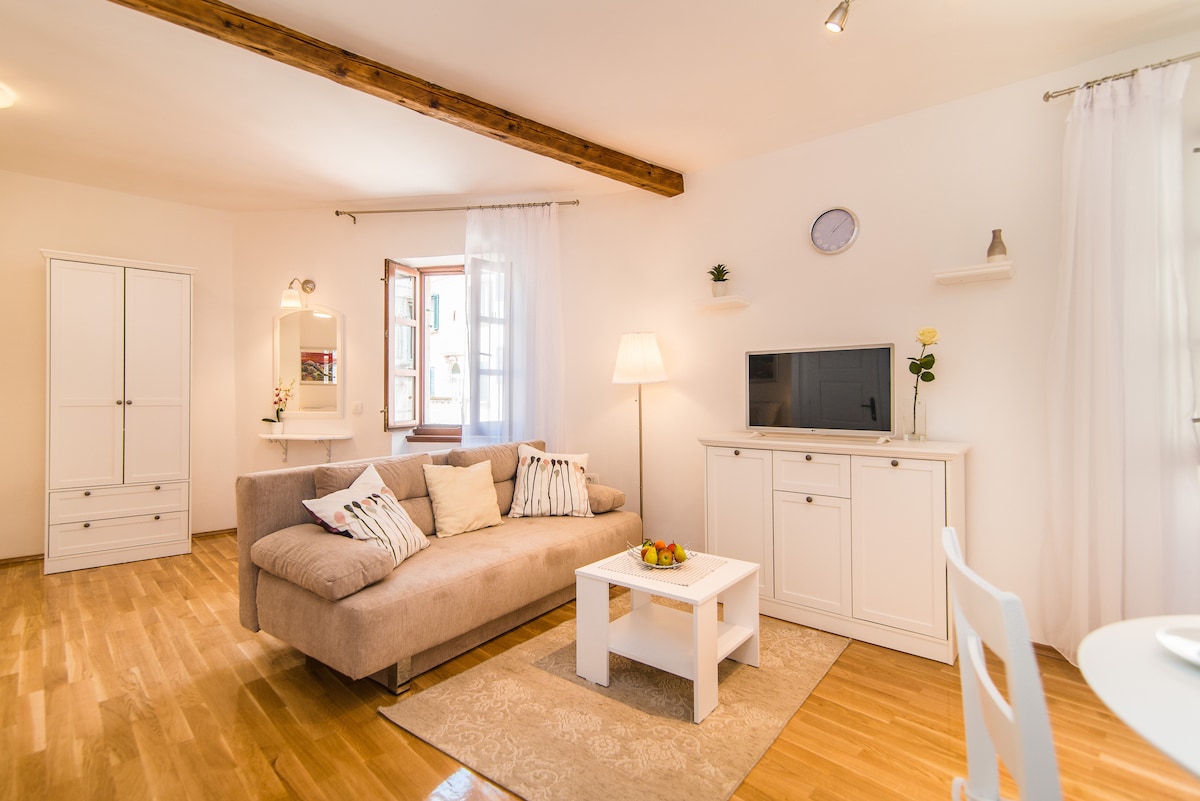 L'encantador apartament estudi (****) està situat en un carrer tranquil al cor de la ciutat vella de Rovinj, a 50 m de la plaça principal. Davant de l'estudi hi ha un espai exterior que els hostes poden utilitzar per descansar. A prop hi ha llocs d'interès de la ciutat de Rovinj: el Museu Nacional, l'arc de Balbi, la casa de Batana, l'església de Santa Eufèmia i altres... i nombrosos bars i restaurants.