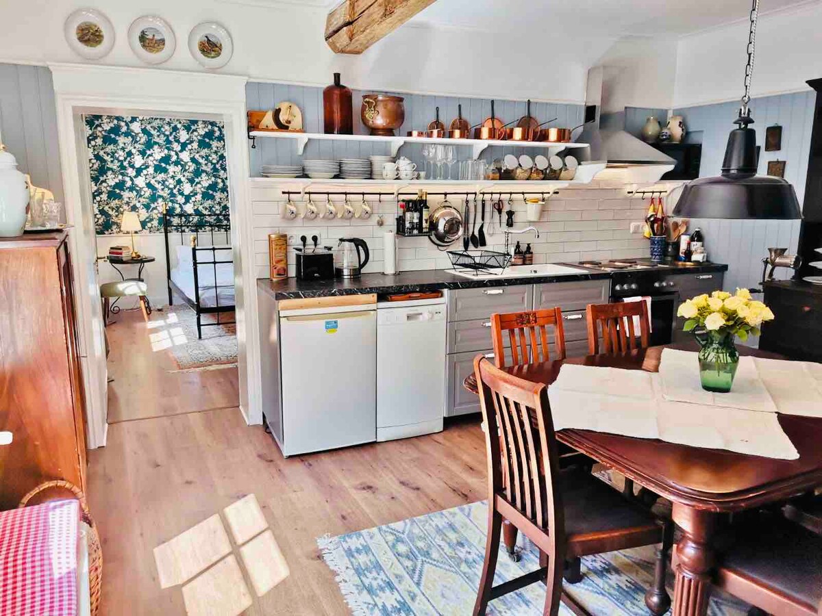 En un apartament d'edifici antic bellament reformat, sostres alts, taules de terra de fusta reals, zona residencial tranquil·la però cèntrica, és fàcil relaxar-se després d'un bon dia de vacances. El pis té dos dormitoris, sala d'estar, cuina i bany i lavabo per a convidats. Una terrassa al jardí està reservada per als hostes. Els llits estan fets d'acord amb els teus desitjos i hi ha tovalloles.