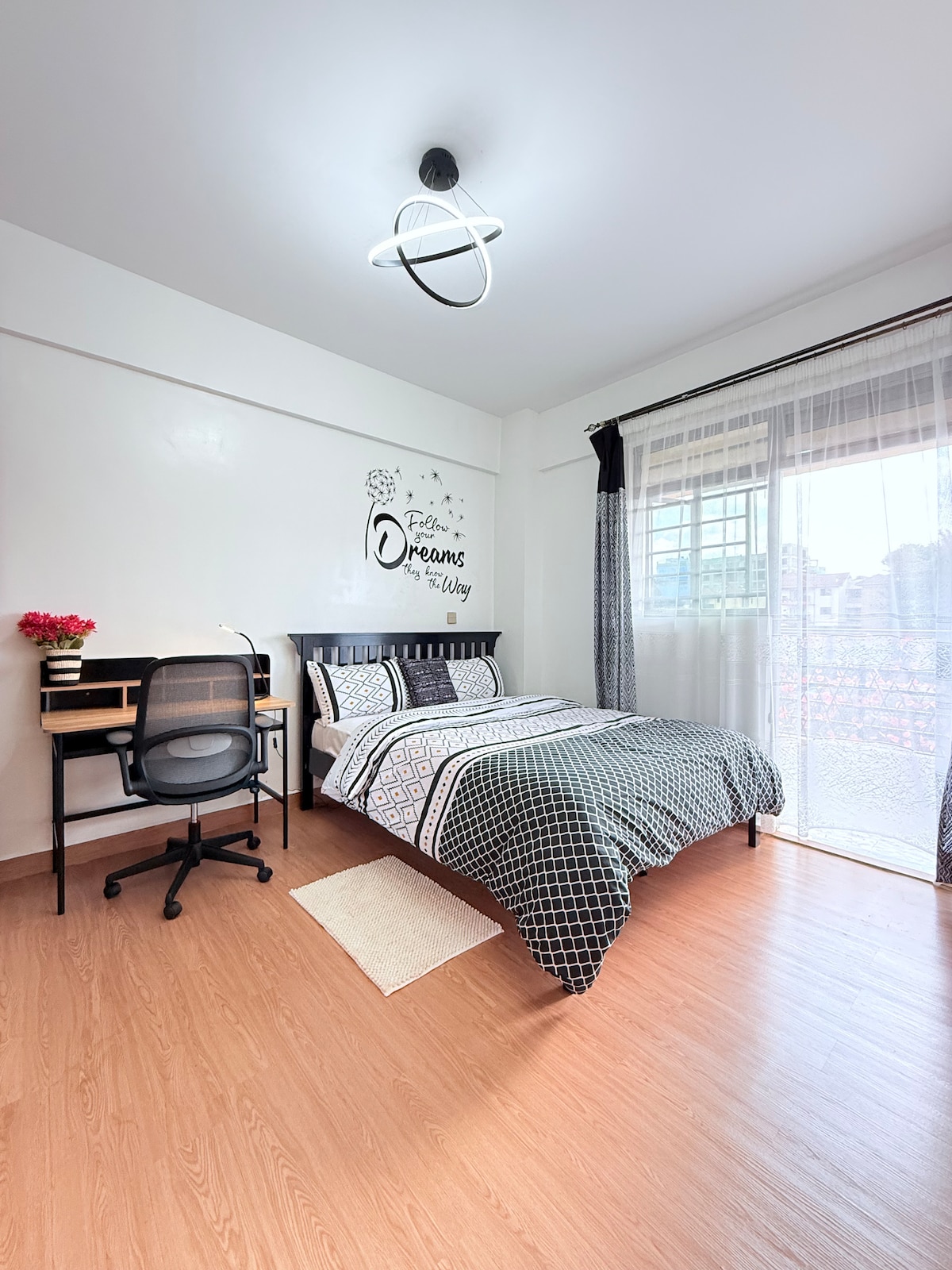 Aquest elegant apartament d'un dormitori en un barri tranquil dins d'una zona aprovada per l'ONU compta amb un disseny modern, una cuina totalment equipada, llum natural, balcó, wifi ràpida i ascensors. Gaudeix d'equipaments i serveis com ara gimnàs, piscina, taula de billar, tennis de taula, zona de jocs per a nens, generador de reserva, aparcament ampli i seguretat les 24 hores. A minuts del centre comercial Two Rivers, de les Nacions Unides i del bosc de Karura. L'aeroport està a 45 minuts per l'autopista i el centre de Nairobi està a 30 minuts en cotxe. El Parc Nacional de Nairobi és a 50 minuts per a una aventura de safari.