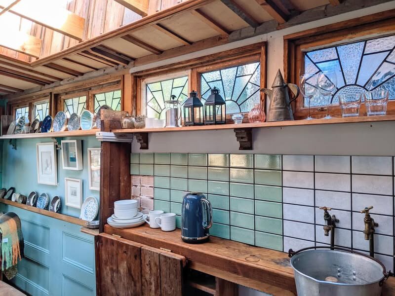 Fern Hollow is a perfect place to retreat and rest, cosily and comfortably at the bottom of my garden, behind my 1950's semidetached home. It is a unique little hideaway in Rusthall, on the outskirts of Tunbridge Wells. Sensitively and skillfully built out of a collection of architecturally salvaged materials. Warmed effectively by a woodburning stove the living area is a comfortable and bright place to work or relax. There is a little kitchen area and a sofa by the fire and dining table.