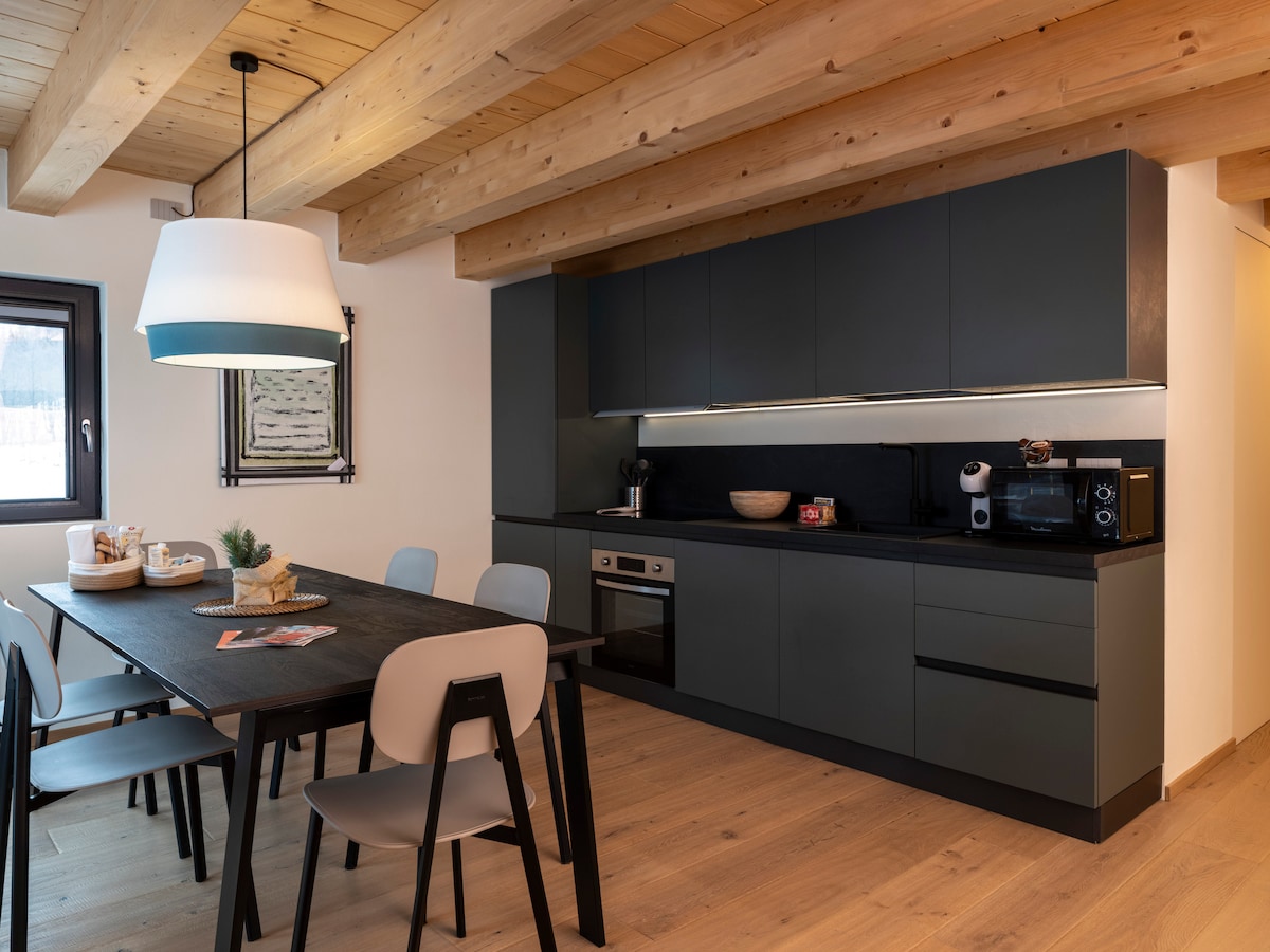 Lussuoso appartamento nuovo con vista Monte Rosa, arredato su misura e dotato di cucina completa, elettrodomestici, TV, wi-fi, lavatrice, biancheria e asciugamani. Terrazzo privato e giardino comune. Parcheggio esterno privato e box su prenotazione con ascensore. A 4 km da Champoluc, 200 m dalla pista di fondo e 30 m dalla navetta per gli impianti. Vicino a negozi e sentieri. Ideale per una vacanza tra comfort e natura.