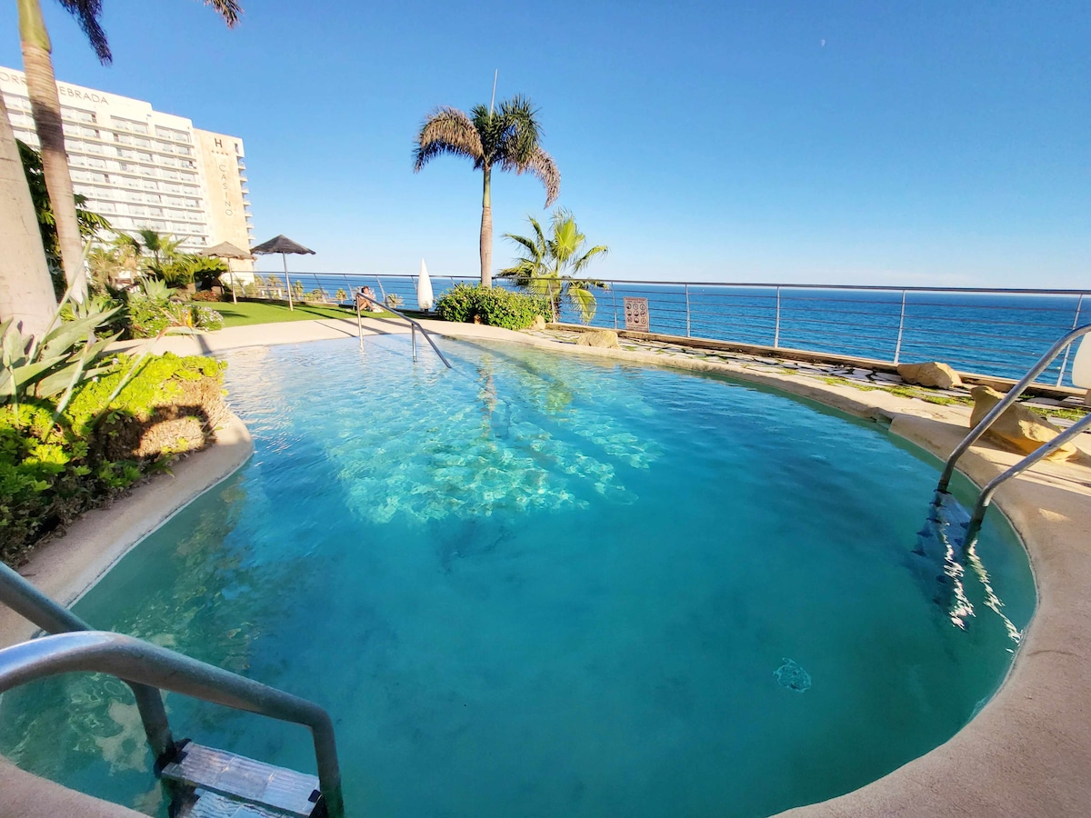 Preciós apartament d'1 habitació, 40 m2 i terrassa de 60 m2. Molt acollidor. Té vistes a l'oceà i sol tot el dia. Mira cap a l'oest. És a la planta baixa. És ideal per a una parella. NO es permeten nadons ni nens. L'edifici té 60 pisos. La piscina és de temporada i acollidora. El meu apartament és a un parell de minuts a peu del passeig marítim, de la platja de Santa Ana i del parc i de les parades d'autobús. La meva cuina està totalment equipada. Hi ha 2 aires condicionats i tots els electrodomèstics són nous. Tinc 600 MB de wifi