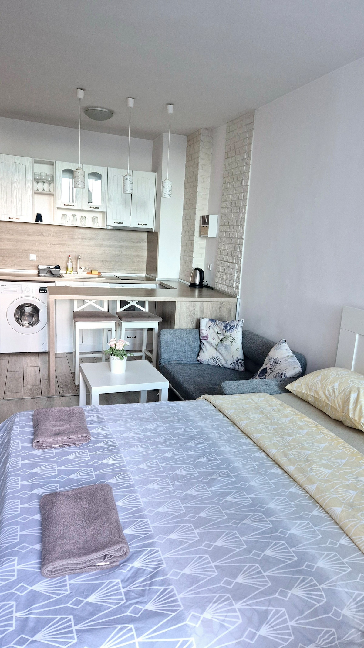 Estudi nou en un edifici modern de nova construcció. Disposa de tot el necessari per a una estada còmoda a la capital: nevera, cafetera, tetera elèctrica, fogons, aire condicionat, televisor, microones, campana extractora, rentadora. Wi-Fi gratuït. A prop de la carretera de circumval·lació i del parc empresarial de Sofia, i de l'estació de metro, a 10 minuts a peu. Balcó on es permet fumar. L'aeroport està a 8 km i s'hi pot arribar fàcilment amb metro i us ofereixo un servei de trasllat des de / cap a l'aeroport. Supermercats, botigues, restaurants a prop