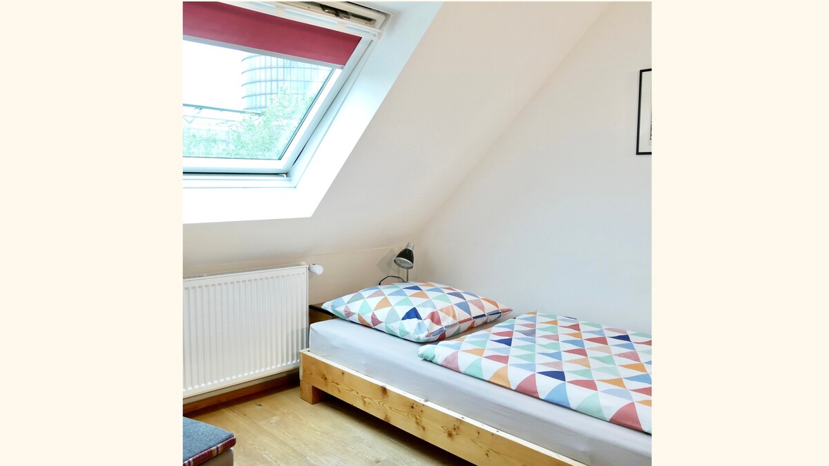 L'estudi es troba a l'àtic de la nostra casa, al sud de la ciutat de Mülheim an der Ruhr, al districte de Holthausen/Raadt. La ubicació tranquil·la directament a la reserva paisatgística no exclou una molt bona connexió de transport. El transport públic fins al centre i a l'estació principal de tren es pot arribar en uns minuts a peu. Amb cotxe estàs a 3 minuts per l'A52. Messe Essen: aprox. 10 min; Messe Ddorf: aprox. 30 min Aeroport Ddorf: aprox. 20 min; CentrO : aprox. 25 min (cadascun amb cotxe)