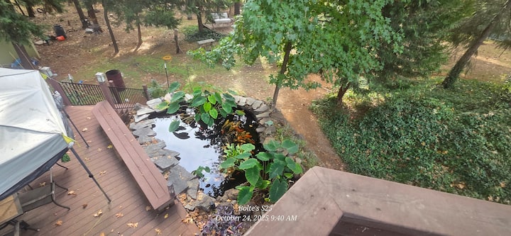 Caseta acollidora apta per a animals de companyia a la vora d'un rierol