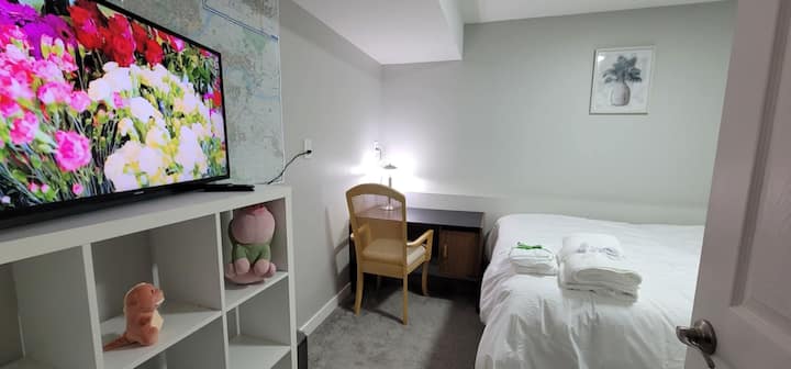 Dormitori alegre amb bany privat, llit Q, TV, aparcament