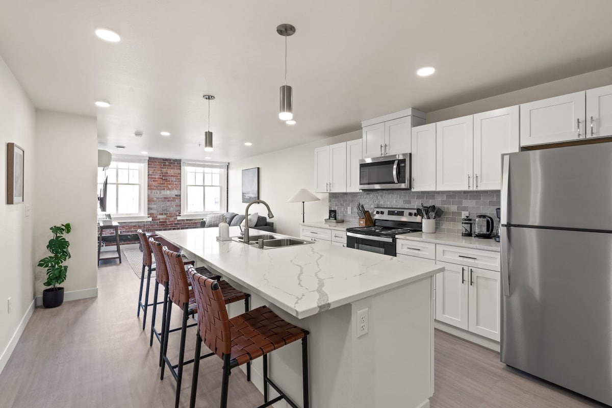 Descobreix el luxe urbà en aquest pis industrial i elegant. Aparcament tancat segur per a 1 cotxe, accés a l'ascensor i gimnàs a només uns passos. Relaxa't al balcó privat amb vistes al pont del tren o gaudeix d'interiors elegants. Dues habitacions espaioses disposen d'armaris amb vestidor, que ofereixen comoditat i comoditat. Dorm en els llits «king size» i «queen size», a més d'un sofà llit «queen» amb un matalàs d'escuma viscoelàstica de 4". Les instal·lacions de bugaderia es troben a l'allotjament. Cerveseria i restaurant a la porta principal