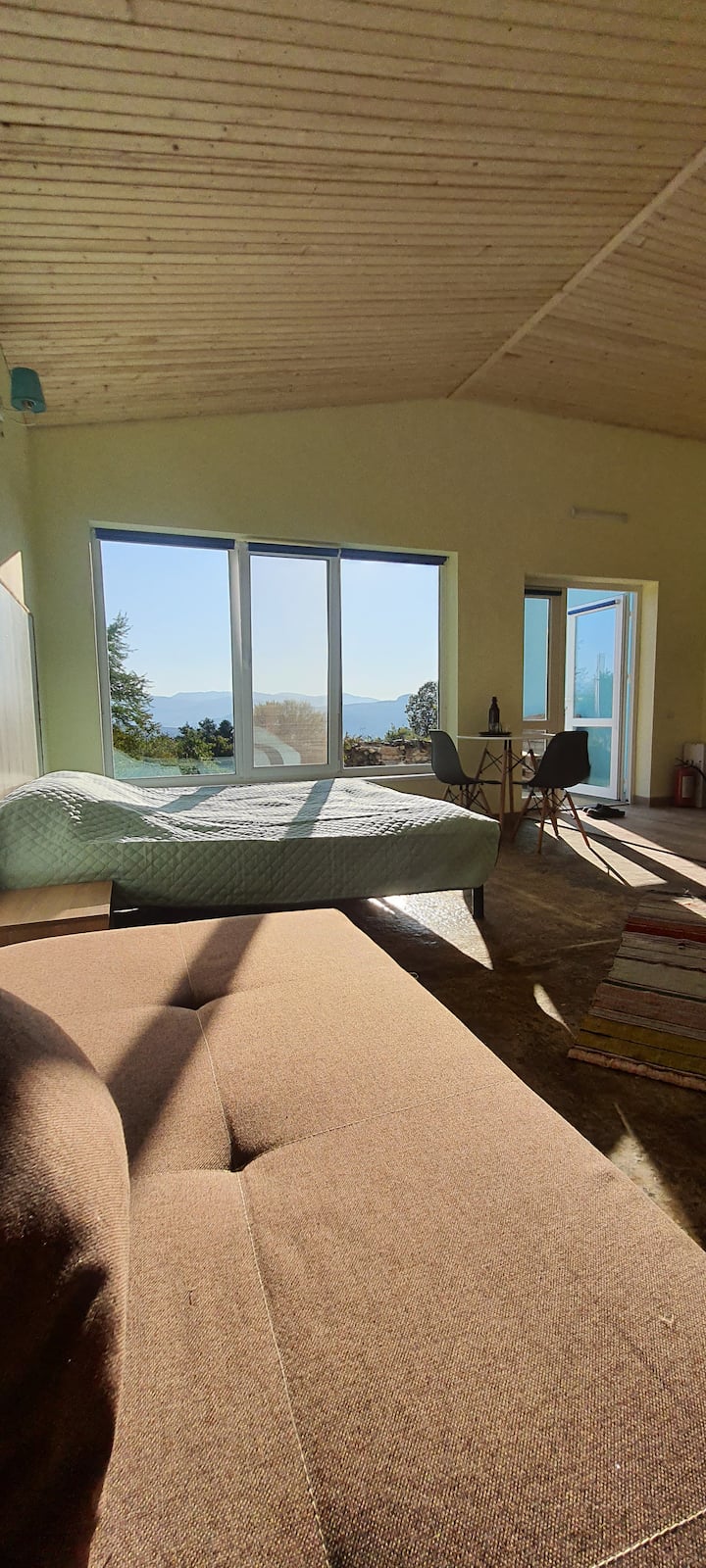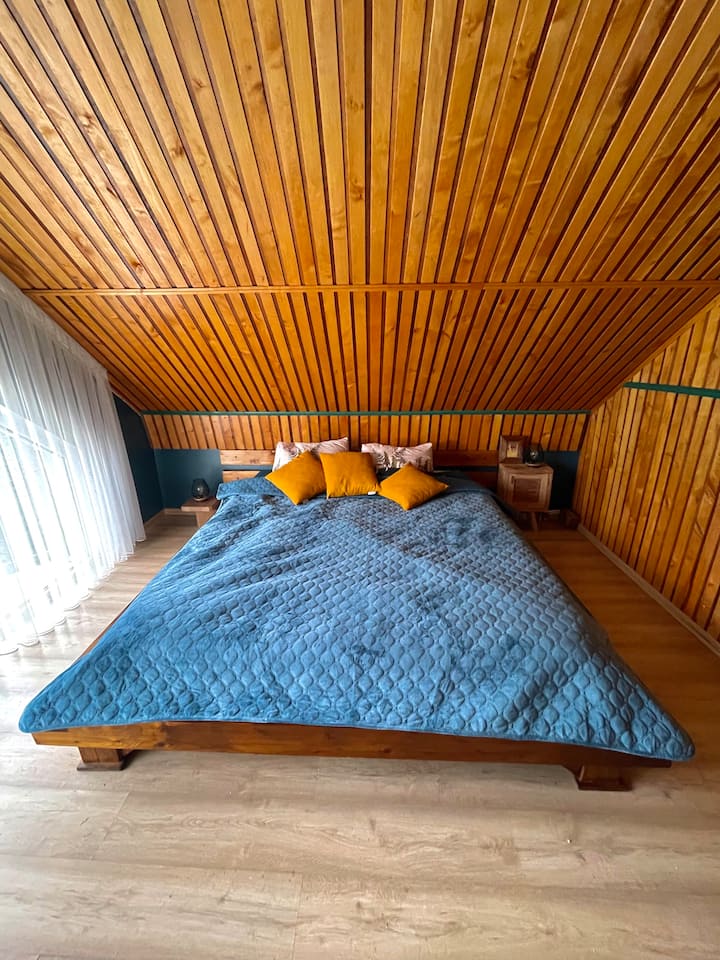 Casa familiar sota les muntanyes i riu amunt, kamin