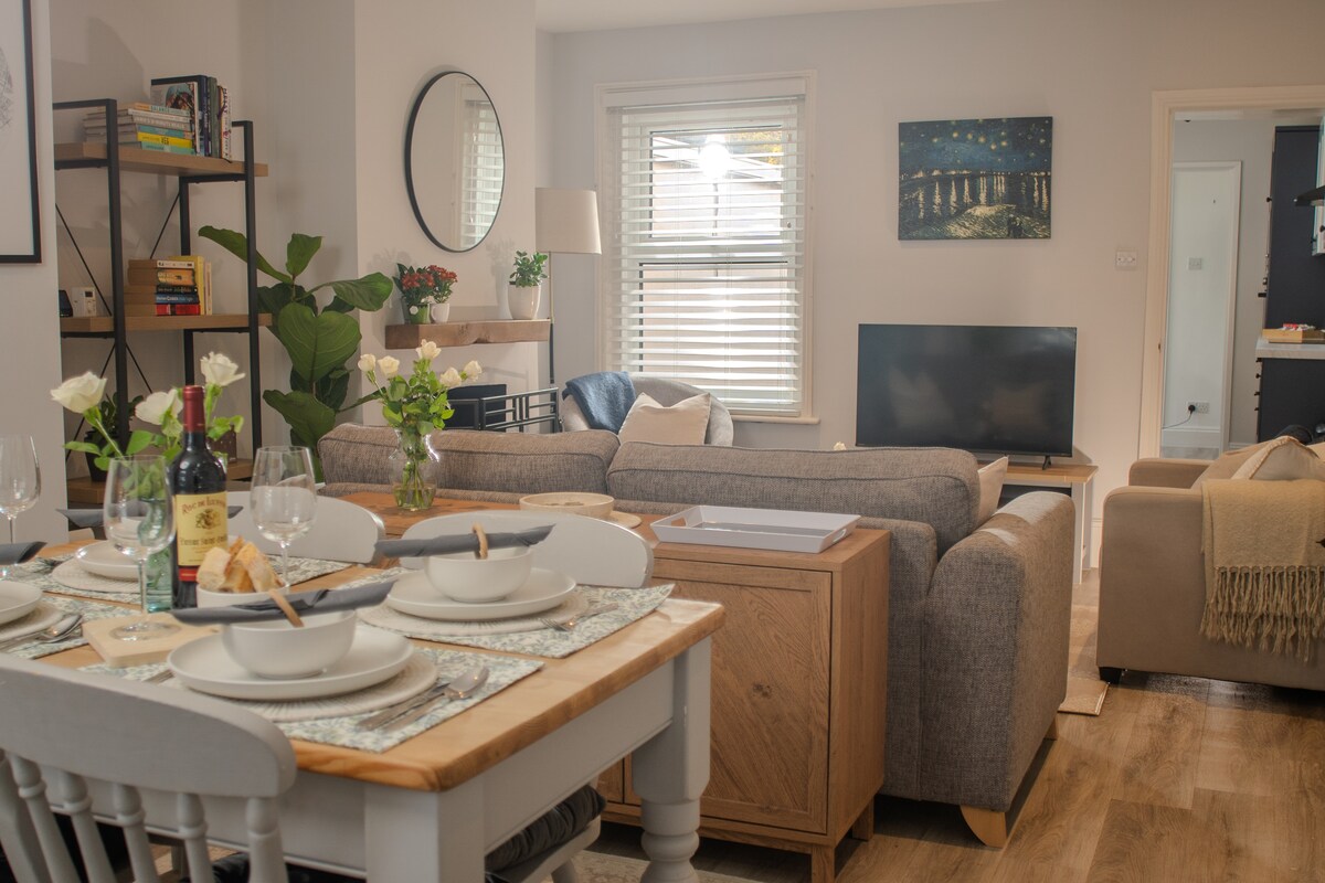 Entra en un pis elegant a la planta superior amb unes vistes impressionants de la ciutat, balcó privat i aparcament segur. A només 10-15 minuts del centre de la ciutat, a 15-20 minuts de la terminal de creuers i a 1,6 milles de l'aeroport de Southampton amb accés ràpid a la M27/M3. Els autobusos i les bicicletes elèctriques a prop fan que explorar sigui fàcil. Llum, modern i tranquil, és la base perfecta, tant si ets aquí per Southampton, un creuer o aventures a Hampshire.