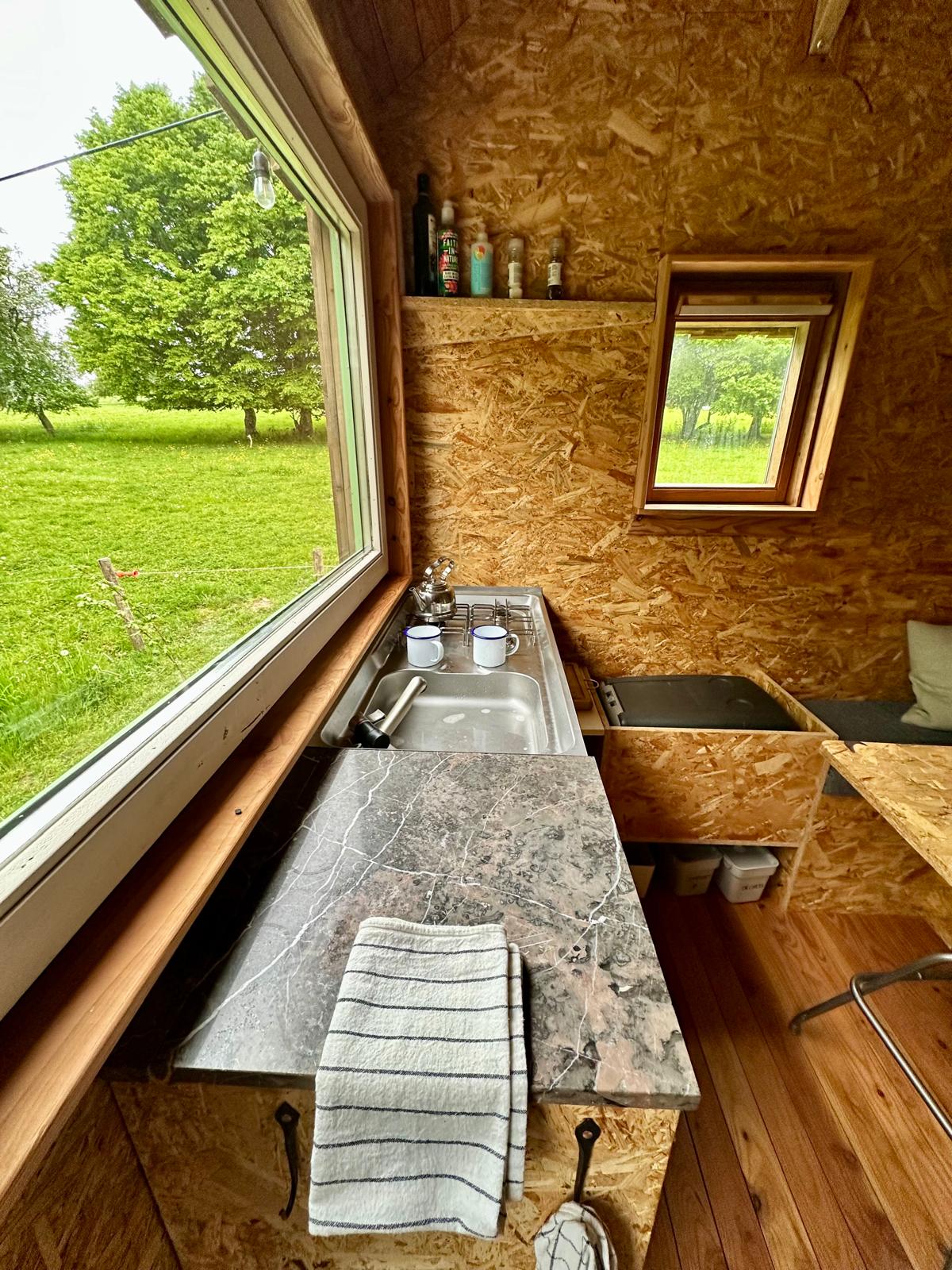 Situada al cor d'un bosc, la nostra caseta de confort de 5 estrelles t'espera a l'altre costat d'un pont de més de 20 metres. No hi ha veïns. Una finestra de vidre amb mirall et dona vistes sense obstruccions d'un paisatge tranquil i relaxant, sense por de ser observat. Al capvespre, un cop estiguis situat al teu acollidor llit, podràs triar entre observar els animals o veure una pel·lícula al nostre projector a sobre... i amb el nostre cel estrellat, és com dormir sota les estrelles. ✨