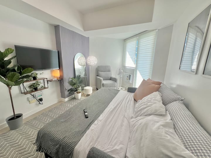 The Gray Oasis | Televisor enorme | Sofà llit | Pany intel·ligent