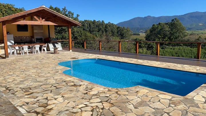 Lloc amb vistes, cascada, llar de foc i piscina.