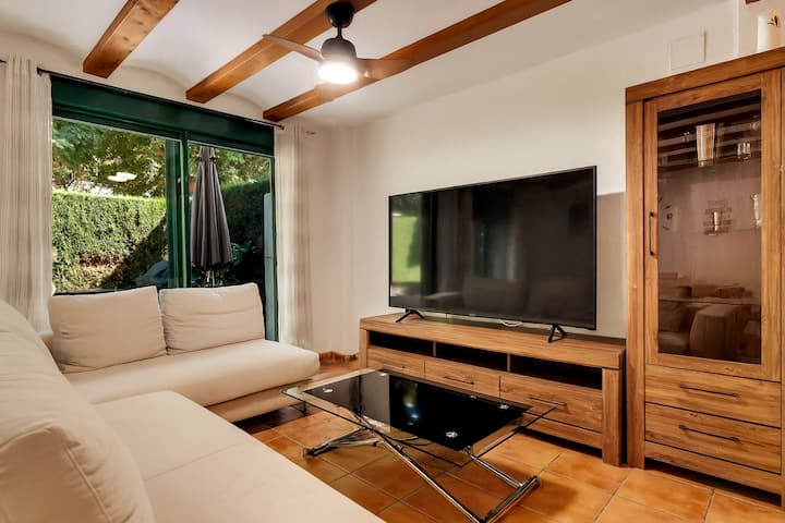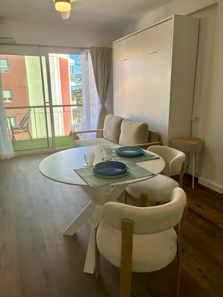 Pis lluminós d'1 habitació, menjador, jardí, a 500 m de la platja