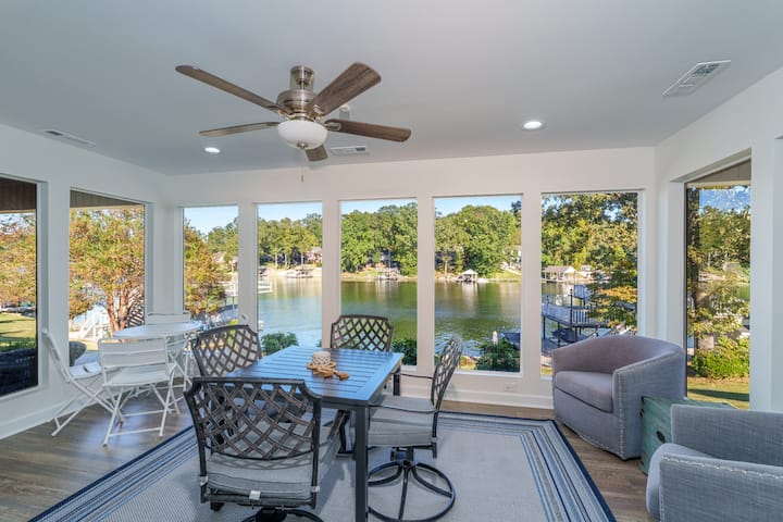 Jardí d'herba a la vora d'un llac, taula de rem, renovat, espaiós