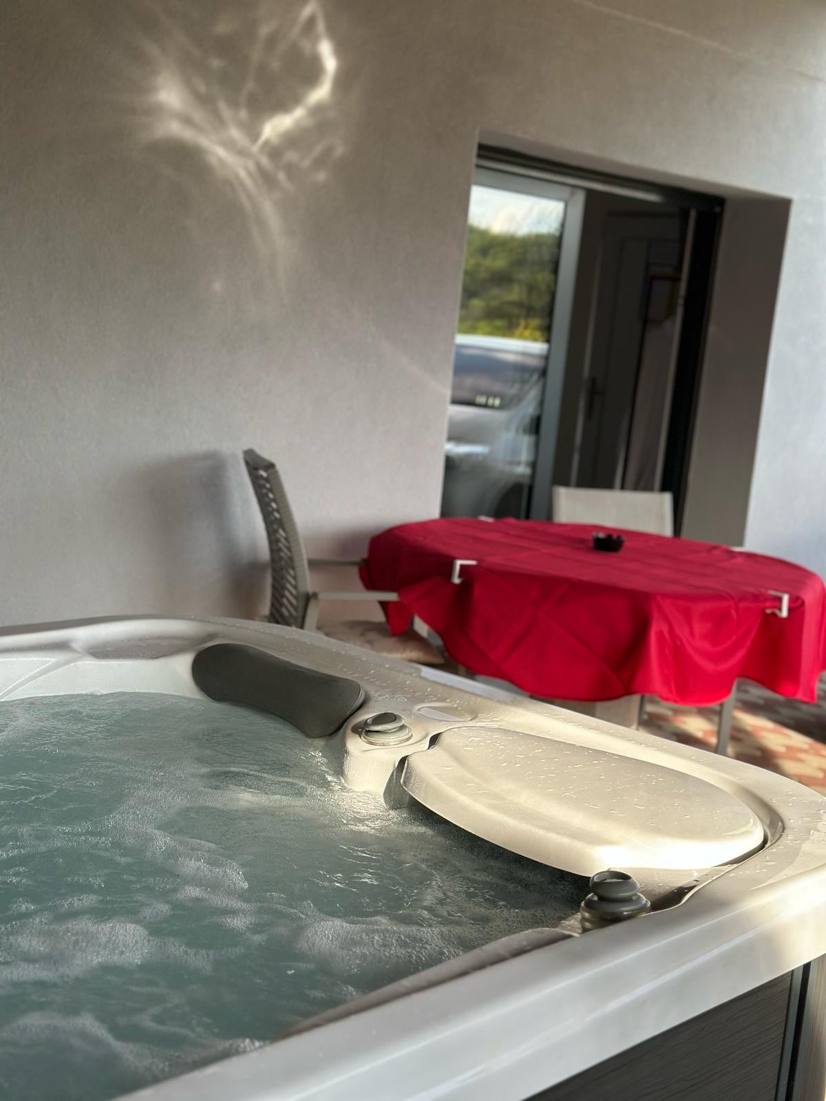 Relaxa't en aquest espai tranquil i elegant amb un entorn verd sota la terrassa o gaudeix d'un massatge a la banyera d'hidromassatge exterior. A la teva disposició barbacoa, llar de foc i gandules de platja, tovalloles de bany, barnús i sabatilles de bany. Per garantir una experiència agradable i per a la higiene i el respecte per l'equipament! La banyera d'hidromassatge està dedicada exclusivament a la relaxació.