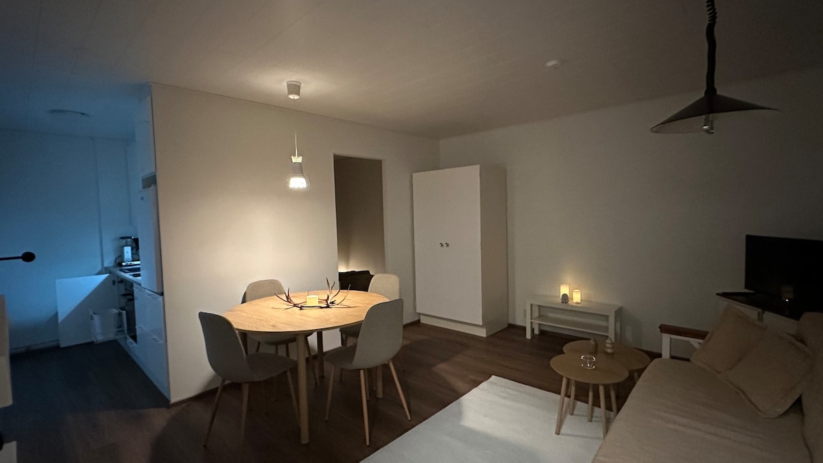 Spacious modern apartment on the 4th floor overlooking the ski resort in the center of the village. Watch the aurora northern lights from your window. Two bathrooms with 3 showers and a sauna. Fully equipped kitchen. Three bedrooms with each 2 single beds and a sofa bed. Free parking space with heating. Ski storage and waxing area. We love helping you with your excursions or questions. Airport bus and ski bus stop in front of the apartment.