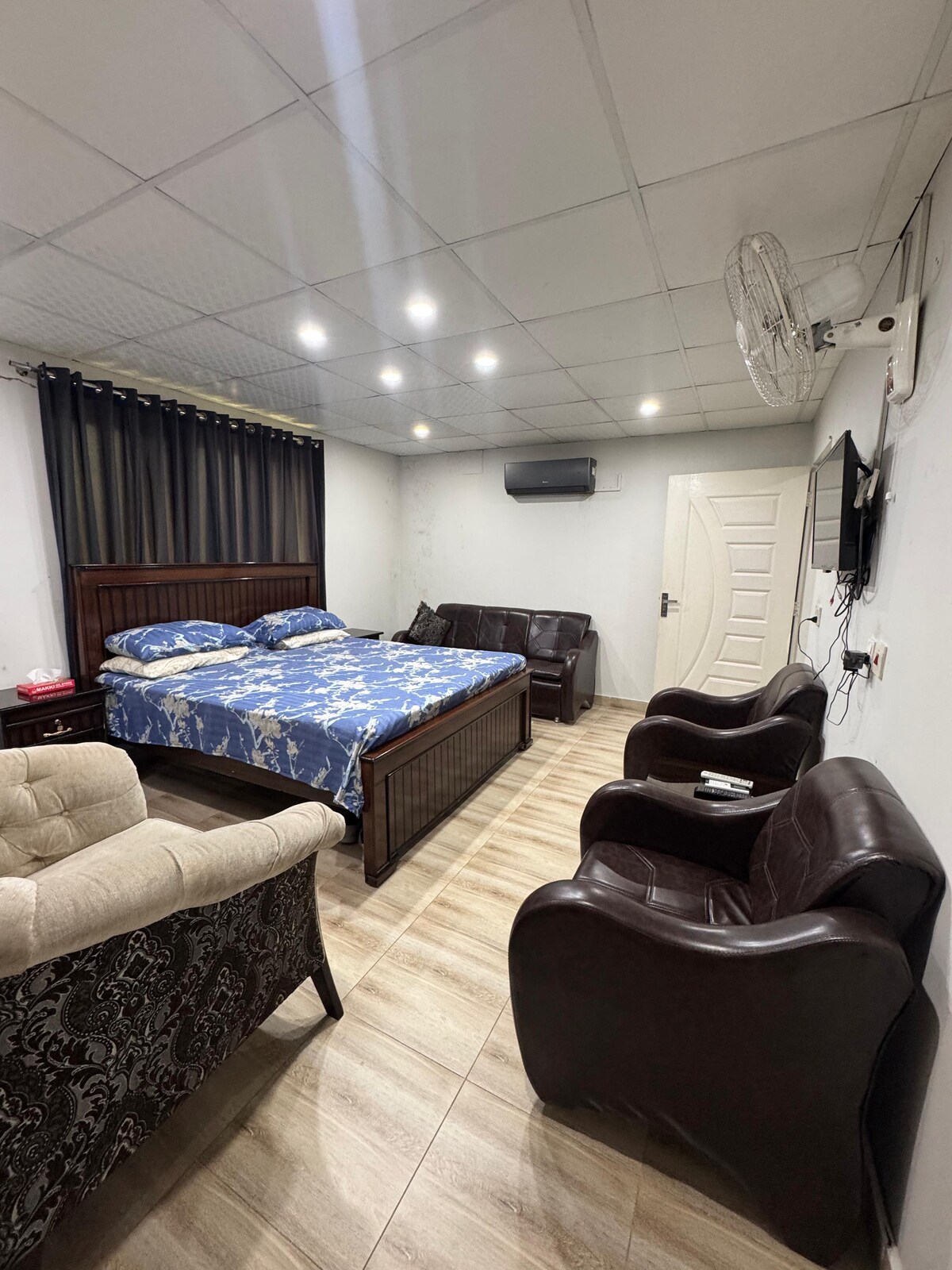 Forget your worries in this spacious and serene space. Its one bedroom apartment with attached bed and a tv lounge with an extra bed sofa sitting and dinning and a separate kitchen equipped with everything.