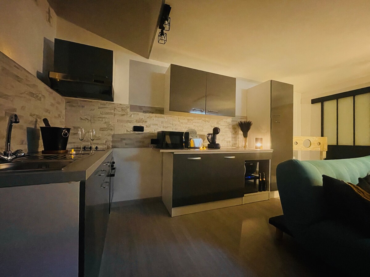 Suite elegant amb entrada independent, dissenyada per gaudir d'una estada còmoda i sense restriccions. Descobriràs un estudi modern i acollidor, que combina fusta natural i una il·luminació suau per crear un ambient agradable a l'instant. Roba de llit de gamma alta, gruixuda i còmoda per dormir bé, bany impecable, wifi ràpida, accés independent: tot plegat fa que et sentis bé des del primer moment, tant si es tracta d'una escapada per a dues persones com d'un viatge de negocis.