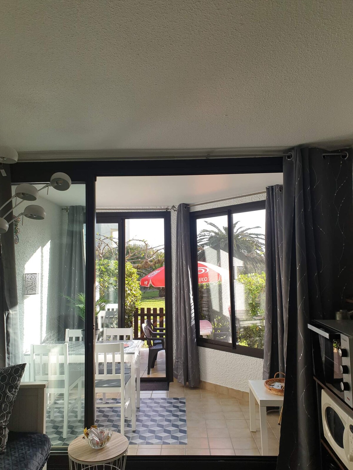 Deux pièces avec terrasse pour profiter du soleil. Situé à 500m de la plage et 700m du centre plage ( commerces , marchés...) et le golf tout proche. Vous profiterez d'un appartement dans une villa de trois appartements avec terrasse individuelle, d'un salon ouvert sur la cuisine avec canapé gigogne d'un couchage, télé, tout le necessaire de cuisine, à l'étage une mezzanine avec un clic clac 2 personnes, salle de douche avec machine a laver, une chambre avec lit 2 personnes et télévision