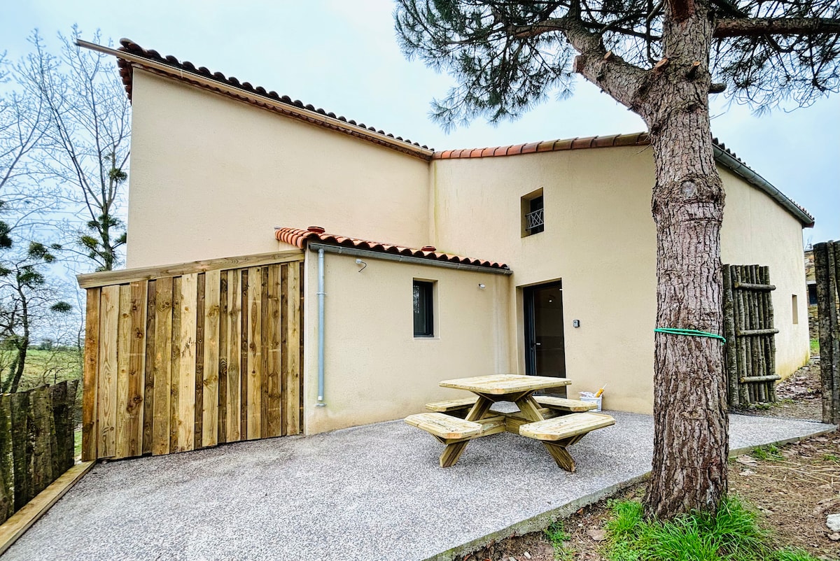 Benvinguts al nostre poble al cor del bosc de la Vendée! La casa està situada a 5 km d'Herbiers i a 15 km de Puy du Fou. Gaudiràs de tot l'espai. L'habitatge té a la planta baixa una gran saló-cocina amb sofà llit. A dalt, 2 petits dormitoris (1 amb 140 llits i 1 amb 2 llits de 90) i 1 bany amb lavabo, dutxa i vàter. A l'exterior, terrassa amb mobiliari de jardí. Aparcament. Llits fets a l'arribada. Llums subministrades.
