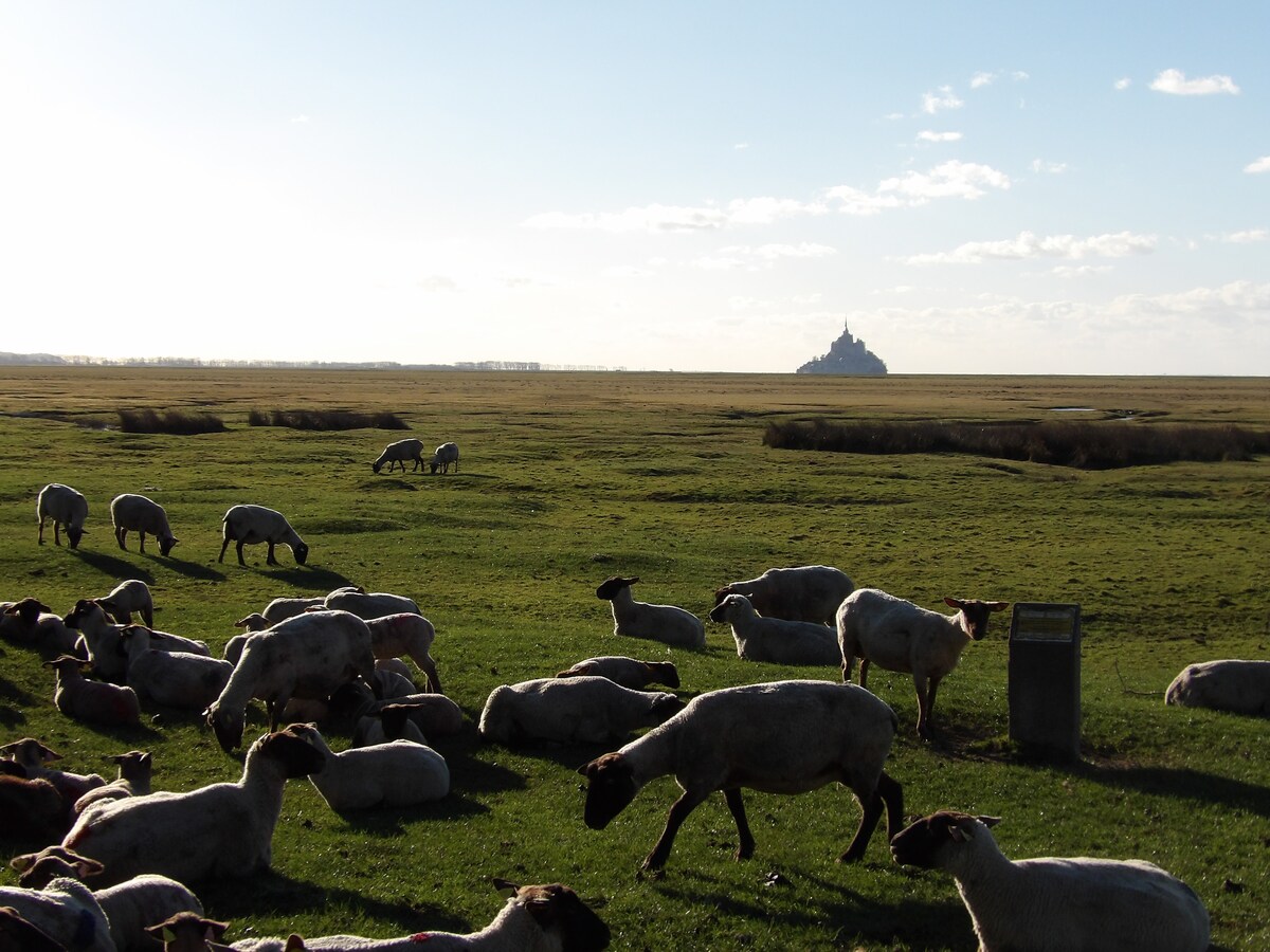 Estudi reformat de 55 m2 per a 2 persones. Situat a 4 km del Mont St Michel i al peu del molí de Moidrey amb vistes al Mont i al parc de fauna salvatge, amb cabres, ovelles, un cavall de Normandia, gallines... Cuina totalment equipada, sala d'estar Pati del bany amb mobles de jardí i vistes al molí. Bicicletes disponibles per anar de franc al Mont St Michel sense anar per carretera al llarg del riu Couesnon a uns 10 minuts dels transbordadors o a 20 minuts de Mont