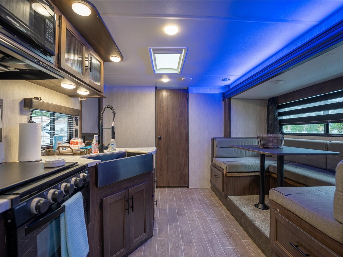T'encantarà aquesta escapada única i romàntica. Dissenyat per crear un entorn íntim per millorar el teu temps junts. La autocaravana és bastant gran i està totalment equipada . El dormitori principal disposa d'un llit king de caixmere a Califòrnia. La propietat té molts serveis que comencen amb una piscina molt gran, il·luminada a la nit. Un moll al riu per gaudir de les vistes. Accés a caiacs a les instal·lacions. Hi ha una zona/terrassa de roba privada opcional amb taula de massatge, banyera d'hidromassatge i gandules. Fa poc vam afegir una foguera