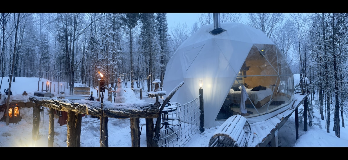 Situat a poc més d'una hora d'Ottawa, Ontario. Aquesta cúpula geodèsica de luxe està totalment equipada amb banyera d'hidromassatge, aire condicionat, calefacció elèctrica, cuina petita amb cuina, sofà, estufa de llenya i bany complet per fer que la teva estada sigui còmoda durant tot l'any. Els llocs per dormir inclouen un llit «queen size» a la planta principal (llit plegable) i un llit «king size» a l'loft. A 5 minuts d'un SAQ, combustible, supermercats lleugers, restaurant i bar. Les nostres cúpules també es troben directament al llarg dels senders oficials per a quad i motos de neu.