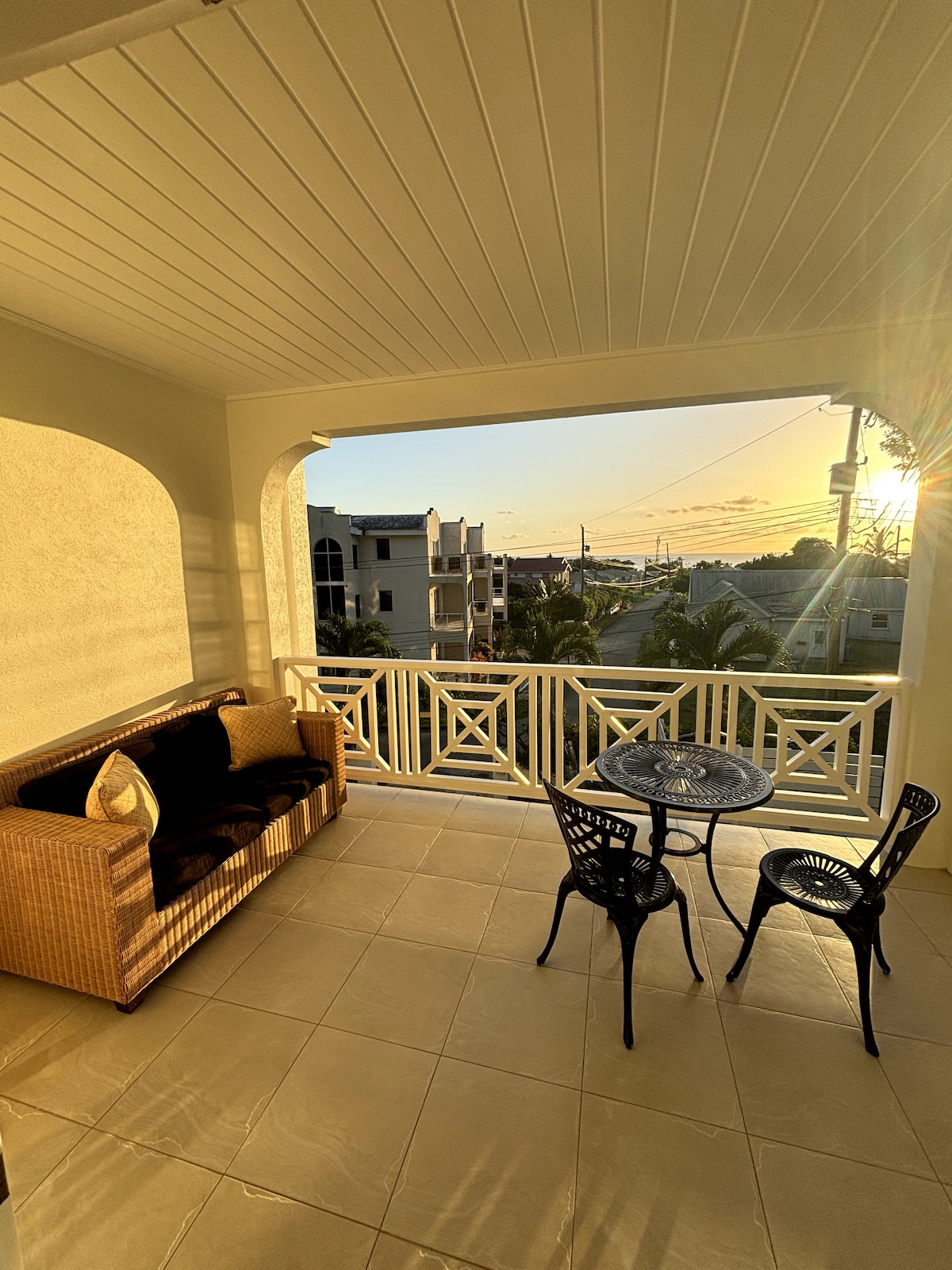Escape to our beachfront condo on the exclusive West Coast of Barbados. This split-level retreat blends contemporary elegance with antique mahogany charm, offering a romantic and family-friendly getaway. Bedrooms: 1. Upstairs: Queen-sized bed, AC. 2. Downstairs: Two twin beds, AC. 3. Living Room: Sofa bed for two. Bathrooms: 1. Upstairs: Ensuite bathroom. 2. Downstairs: Half bathroom. Balcony: Stunning sea views.