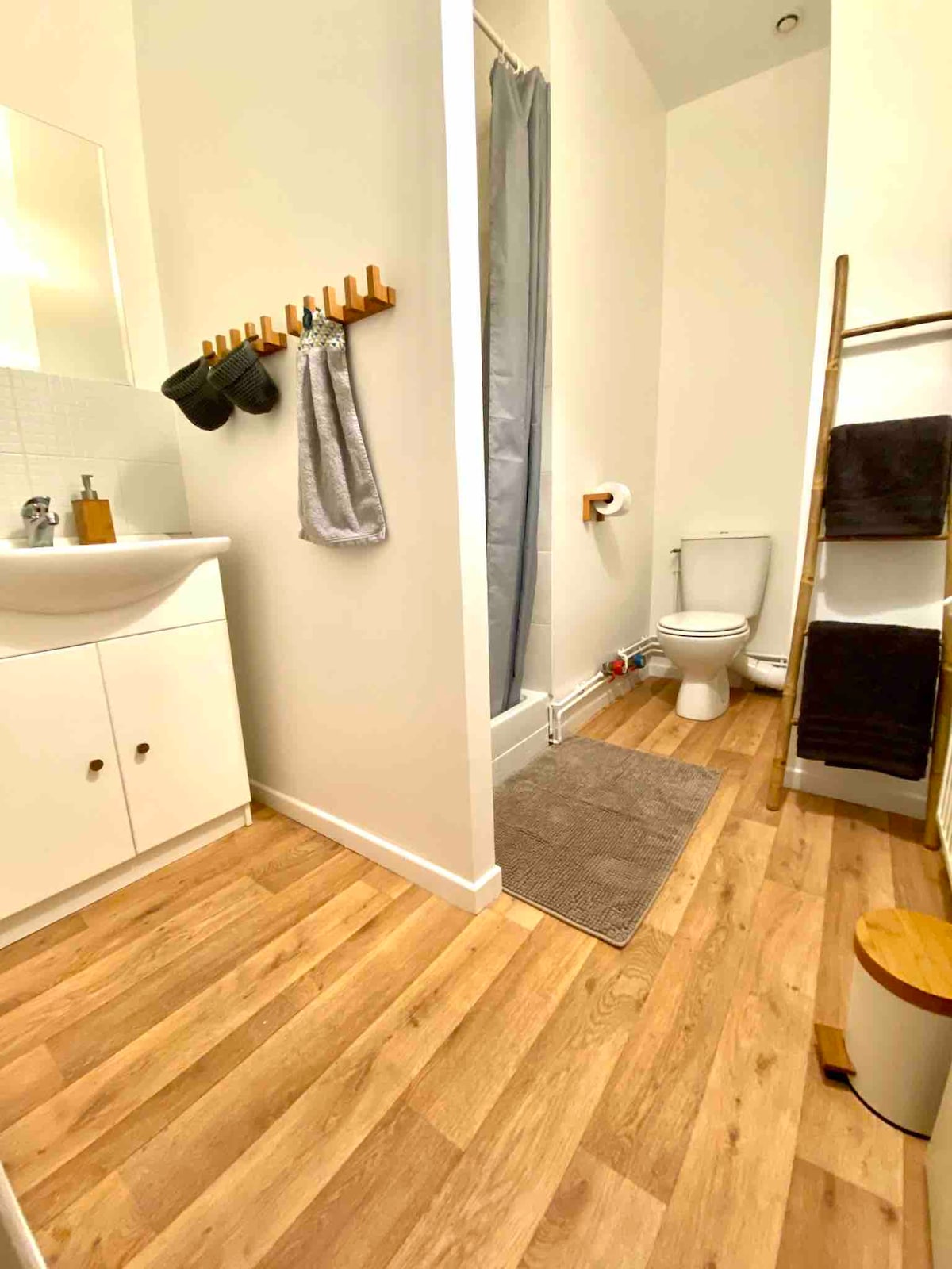 Estudi de 15 m2 a 5 minuts a peu de l'estació de TGV. Davant del centre de formació de la SNCF. Gaudeix d'una sala d'estar amb taules nusos per menjar/treballar, televisor, cuina lineal amb vitroceràmica, etc. En aquesta sala d'estar hi ha un llit armari retràctil molt fàcil de manipular (140 x 200 cm). Al bany hi ha els elements bàsics: dutxa, lavabo, columna i vàter. Es proporciona roba de llit i de bany!