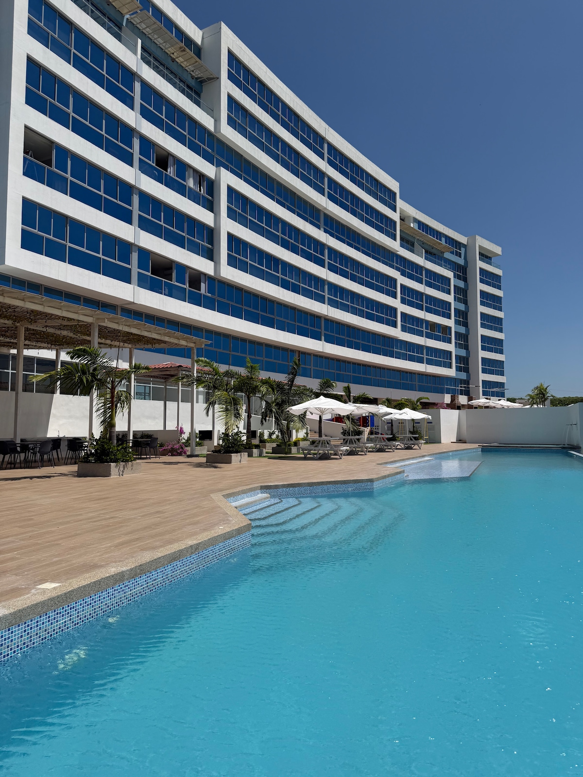 ☞ Oceanview ☞ Piscina ☞ Jacuzzi ☞ Aparcament a l'edifici ☞ Terrassa amb gandules ☞ Dormitori principal amb aire condicionat i llit de matrimoni ☞ Wifi ☞ Aire condicionat a la sala d'estar ☞ Cuina totalment equipada ☞ Nevera ☞ Microones ☞ Televisor i un sofà a la sala d'estar ☞ Ús de les zones comunes de 10:00 a 22:00